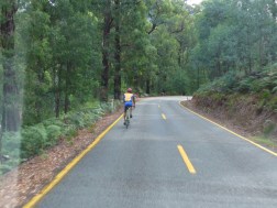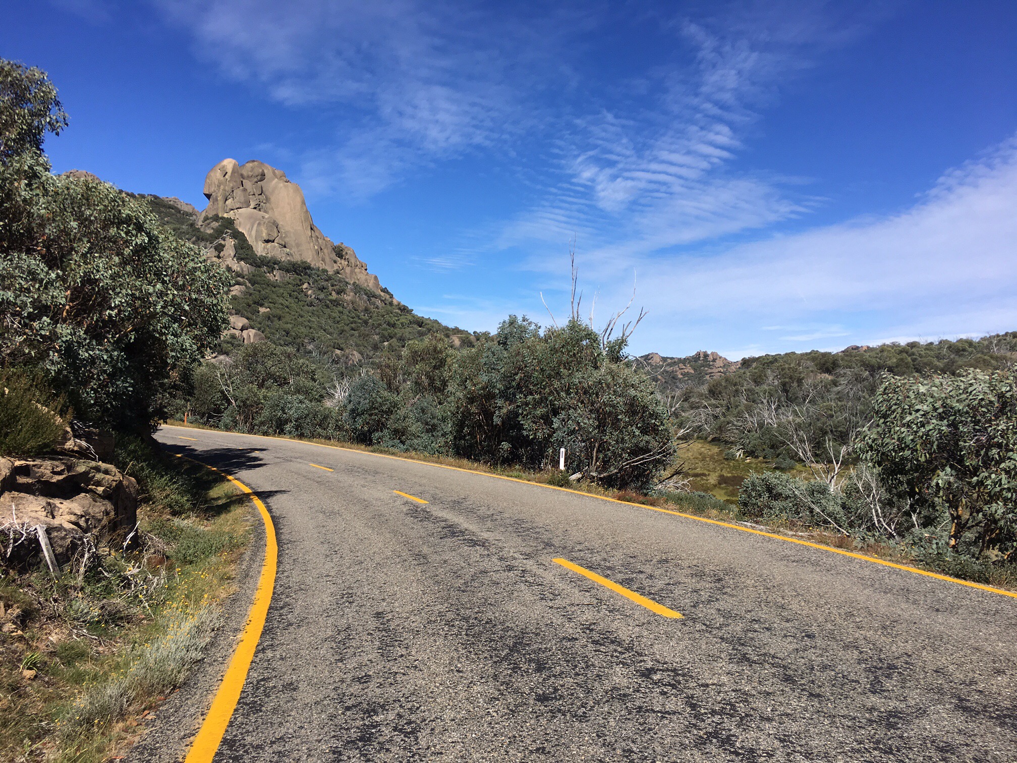 Vanuit het dal fiets ik heerlijk over het asfalt tussen de vele kleurrijke hoge bomen door. Dan passeer ik het bord ‘National park Mt Buffalo’ en begint het stijgingspercentage gestaag op te lopen. Zo vroeg op de ochtend is de weg heerlijk leeg. Ik hoor alleen het monotone geluid van een vers gesmeerde ketting en de lorekeets die met hun gezang een duet vormen met mijn ronddraaiende pedalen terwijl ik de berg op dans met mijn 82kg (beetje zwaar voor een klimmer).